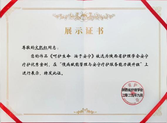 2025年9月5日,在陕西省护理学会相关活动及省级培训班中,我院肿瘤科护士文凯红的作品《呵护生命 泊于安宁》,获评 “陕西省护理学会安宁疗护优秀案例”(全省仅6个案例入选),并在省级培训班上进行大会展示。此次荣誉的获得,不仅是对文凯红护士个人专业能力的高度认可,更充分彰显了我院护理团队在安宁疗护领域的专业素养与创新实力,体现了我院护理工作在人文关怀与诊疗服务结合上的突出成果。