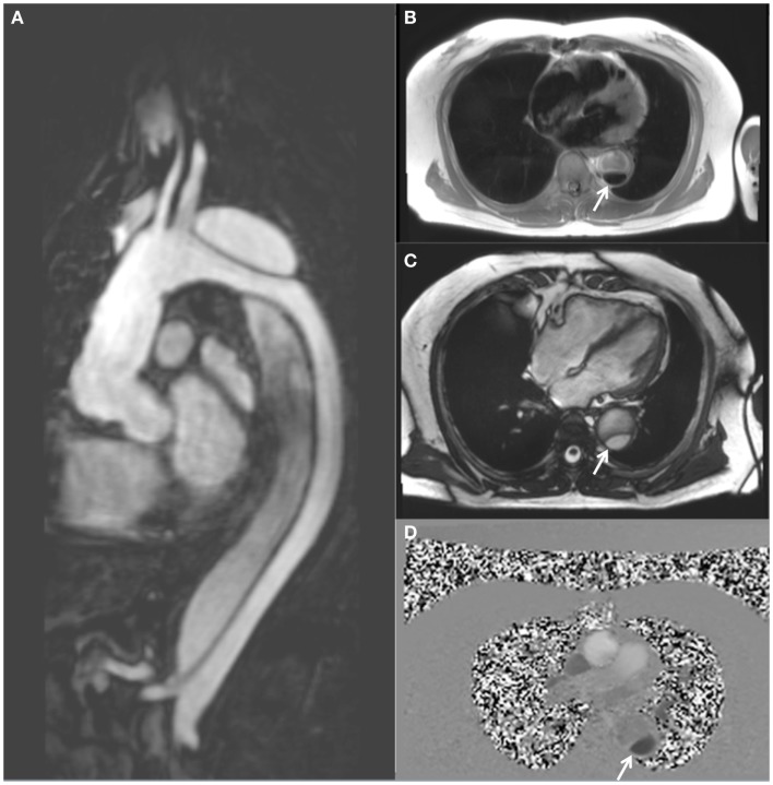 黑血图;(C)TrueFISP电影图;(D)相对比图,显示降主动脉的真腔和假腔的流动模式,真腔由白色箭头指示。