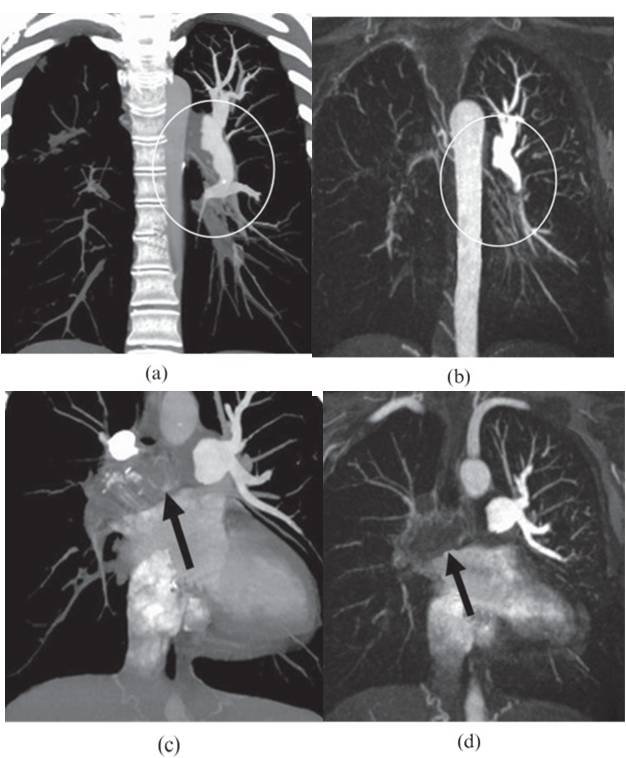 47岁,女性,继发性慢性血栓栓塞性肺动脉高压。CTA(a,c)和CE-MRA(b,d)MIP图显示左肺动脉中的血栓向下叶基底段延伸(白色圆圈内),右肺动脉完全闭塞(黑色箭头)。