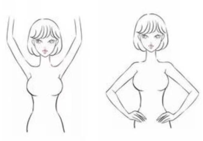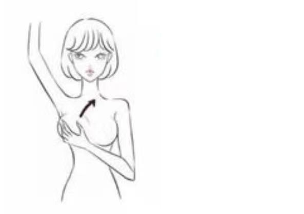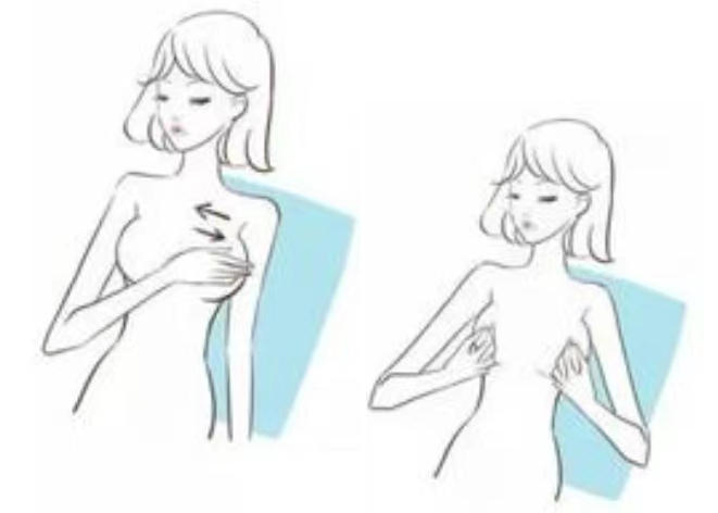 1.站在镜前以各种姿势(两臂放松垂于身体两侧,双手撑腰、向前弯腰或者双手高举枕于头后),比较双侧乳房大小形状是否对称、轮廓有无改变,乳头有无内陷及皮肤颜色,