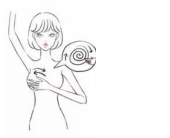 2.于不同体位(平卧位或侧位),将手指平放于乳房,从外箱乳头环形触摸,检查有无肿块,