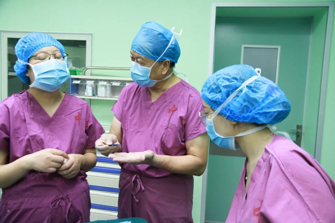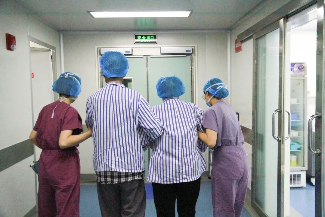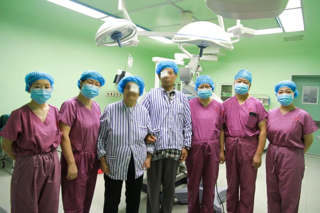 十几分钟后,手术结束,两位老人开心的拉着为自己做手术的医护人员合影,并在他们的护送下回到病房。